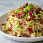 Transfer the cheesy spaghetti mix into a greased 9×13 inch baking dish. Evenly sprinkle the remaining mozzarella cheese over the top for that irresistibly melty, golden layer. Then, scatter the reserved bacon pieces on top and add the chopped green onion, which adds vibrant color and a touch of freshness against the richness of the dish.