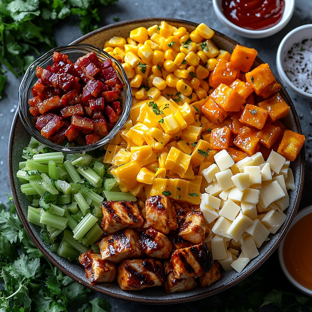 In a large bowl, add the cooked pasta, cooled grilled chicken, corn, bacon, chopped bell pepper and celery, and cubes of cheddar cheese. Pour in the BBQ mayo dressing and gently toss until everything is evenly coated. This salad shines whether served immediately at room temperature or chilled the next day after the flavors meld, making it wonderfully versatile.