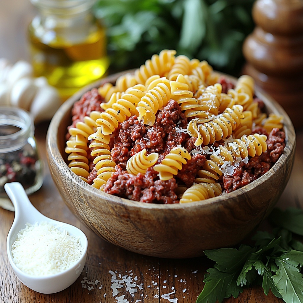 A creamy and comforting dish featuring tender ground beef and rotini pasta tossed in a rich garlic Parmesan sauce, perfect for a quick and satisfying weeknight meal.