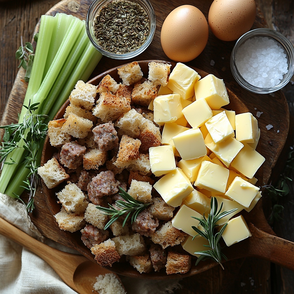 These ingredients are simple yet essential, each one carefully chosen to build layers of flavor, texture, and color that bring this stuffing to life. From fragrant fresh herbs to hearty bread cubes and robust sausage, every element plays a starring role.