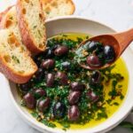 Transfer the oil mixture to a serving dish, making sure the olives and herbs are well distributed so every dip is packed with flavor. Serve immediately with fresh, warm, crusty bread on the side. Invite everyone to dip generously and enjoy the explosion of tastes in every bite.