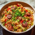 This Cajun sausage and rice skillet is a flavorful, one-pan dinner that’s easy to prepare and packed with vibrant Cajun spices. Featuring Andouille sausage, aromatic vegetables, and tender rice simmered in chicken broth, it’s a comforting dish perfect for weeknight meals.