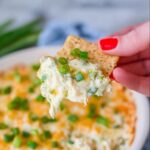 - Serve and Garnish: Remove from oven, garnish with additional chopped green onions, and serve warm with your choice of crackers, tortilla chips, Ritz crackers, or pita chips for dipping.