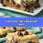 Delicious and indulgent Chocolate Chip Cheesecake Bars featuring a chocolate chip cookie dough crust and topping, layered with a creamy, smooth vanilla cheesecake filling. Perfectly baked for a soft, rich treat that combines the best of cookies and cheesecake in every bite.