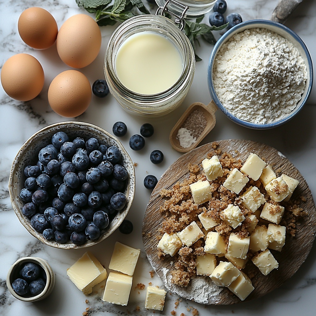Getting ready to whip up this Classic Blueberry Buckle Recipe is a breeze because the ingredients are straightforward yet essential in creating those perfect textures and flavors. Each component plays its part—from the tender cake flour base to the fresh blueberries that bring a vibrant pop of color and flavor, and of course, the buttery streusel topping that adds irresistible crunch.