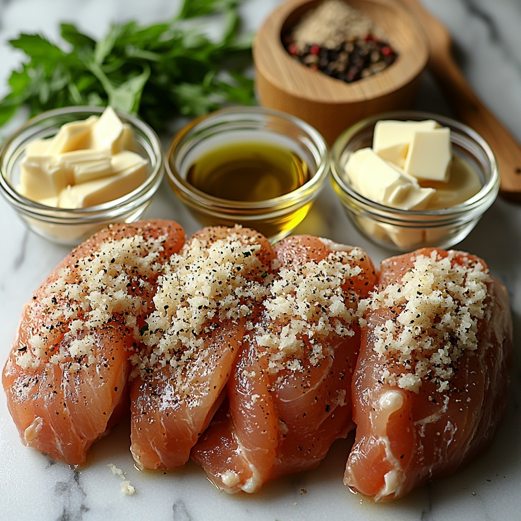 Begin by patting your chicken breasts dry to ensure the seasonings stick well and the chicken sears beautifully. If your breasts are thick, slice them horizontally to create thinner cutlets that cook evenly and quickly. Season both sides generously with salt, black pepper, and garlic powder. These simple spices set the flavor foundation for the entire dish.