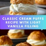 Classic Cream Puffs featuring a delicate, airy choux pastry shell filled with a luscious vanilla pudding and whipped cream filling, subtly enhanced with almond extract. Perfectly baked until golden and light, these cream puffs are an elegant dessert that’s easy to make and sure to impress.