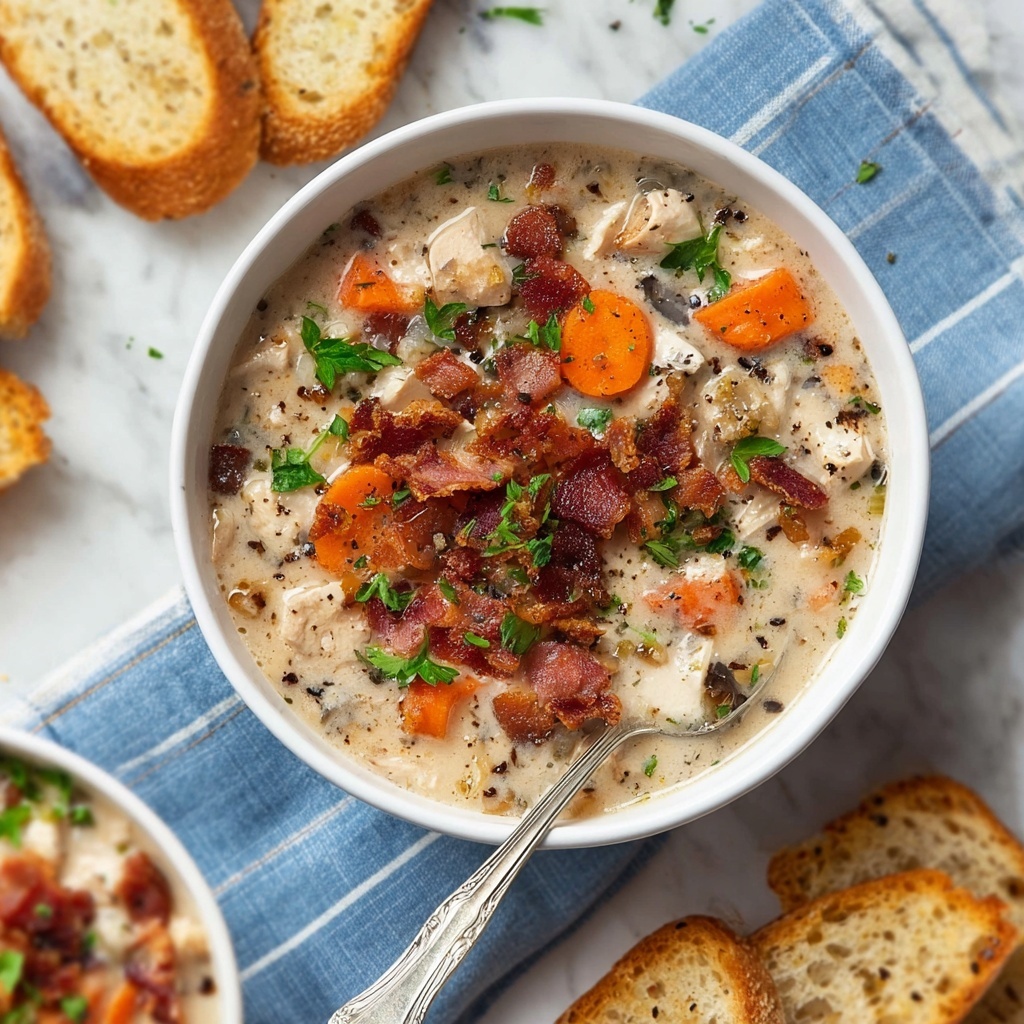 This comforting Creamy Chicken and Wild Rice Soup combines tender chicken, nutty wild rice, fresh vegetables, and crisp bacon in a rich, creamy broth. Perfect for chilly days, this hearty soup features a delicious balance of flavors with sautéed mushrooms, fresh thyme, and a splash of white wine for depth. It’s an ideal make-ahead meal that warms the soul and satisfies the hunger.