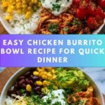 A flavorful and vibrant Chicken Burrito Bowl featuring marinated grilled chicken, seasoned rice, black beans, corn, fresh vegetables, and creamy avocado, topped with cheese, sour cream, cilantro, and lime wedges for a satisfying and colorful meal.