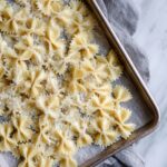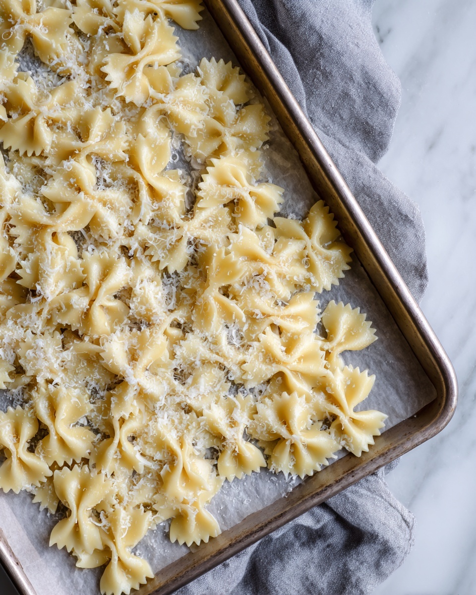 Spreading the pasta in a single layer on your baking sheet is essential for even cooking. Also, tossing the pasta halfway through baking helps all sides brown and crisp uniformly.