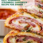 This Stromboli Sandwich is a delicious, savory rolled Italian-American classic stuffed with layers of ham, salami, pepperoni, Pepper Jack, and mozzarella cheeses, baked to golden perfection. Perfect for a hearty dinner or sliced into appetizers for a crowd, it features a garlic butter crust and a flavorful Parmesan topping served with warm marinara for dipping.
