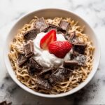 - Garnish and Serve: Serve the pancake spaghetti warm, topped with the reserved Oreo crumbs, maple syrup, and whipped cream as desired for an extra sweet and indulgent breakfast treat.