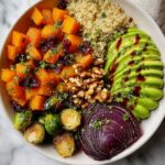 A hearty and nutritious Fall Roasted Veggie Bowl featuring caramelized butternut squash, Brussels sprouts, sweet potatoes, and red onions, nestled atop a bed of fluffy quinoa. Enhanced with warm spices, crunchy walnuts, sweet dried cranberries, creamy avocado, and a tangy balsamic glaze, this bowl is a vibrant celebration of autumn flavors perfect for a wholesome meal.