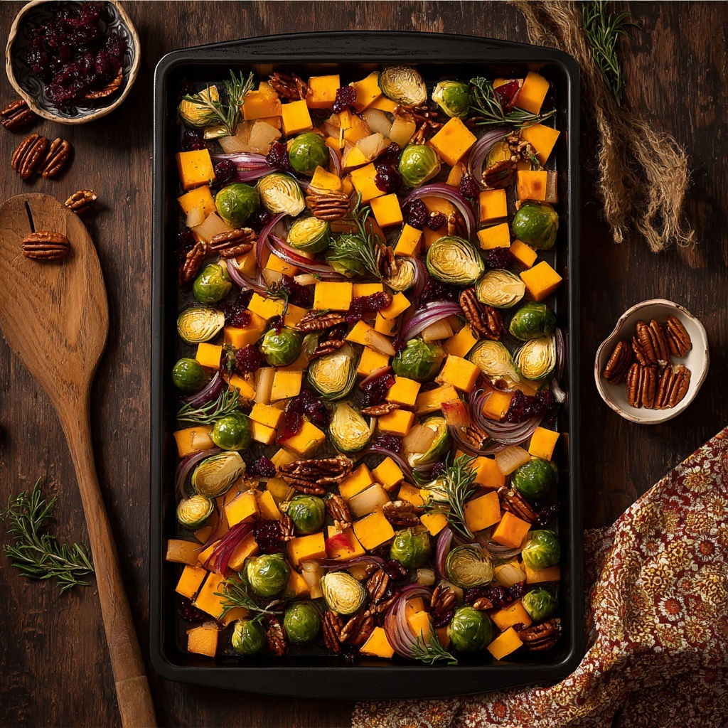 Sprinkle the chopped pecans and dried cranberries over the roasting vegetables. Give everything a gentle toss to distribute them but keep the single-layer arrangement intact. Return the pan to the oven for an additional 5 to 10 minutes. By the end, the squash should be tender and sweet, Brussels sprouts golden, onions soft and luscious, and apples wonderfully glossy and aromatic.