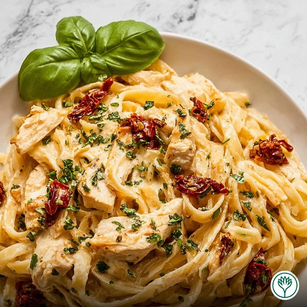 Plate your Fettuccine Alfredo with Chicken and Sundried Tomatoes Recipe while it’s hot, scattering the fresh chopped parsley over the top. The green color brings a fresh contrast to the rich creaminess, making each serving look as good as it tastes.