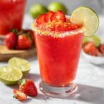 3. Serve and Garnish: Pour the blended margarita into the prepared glasses. Garnish each glass with a fresh strawberry and a lime wedge to add a pop of color and extra flavor to the presentation.
