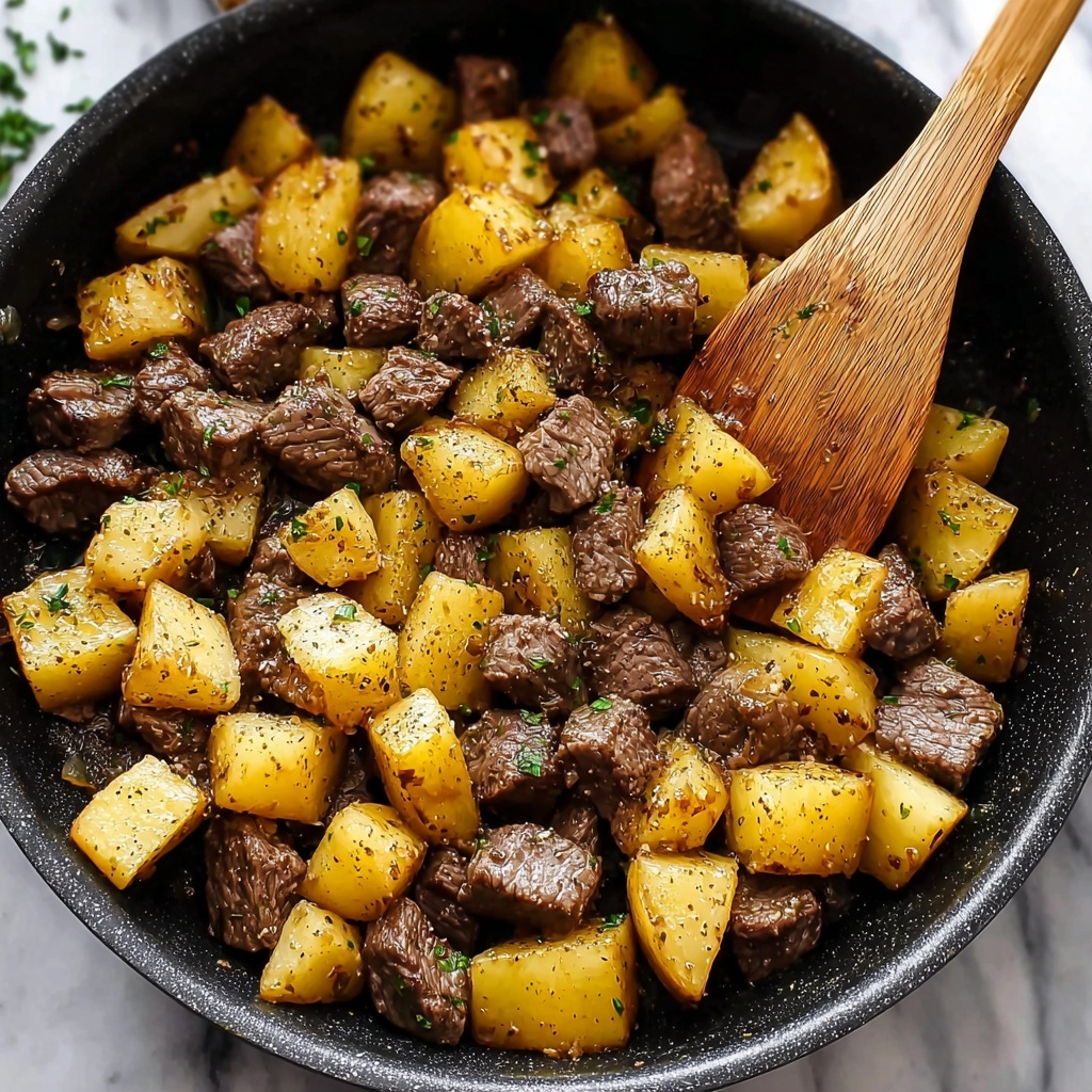 Once the steak bites are cooked, add back the herb-coated potatoes into the skillet. Toss everything together gently but thoroughly so the garlic butter coats both the potatoes and steak evenly. Taste and adjust seasoning if needed. This melding of flavors is what makes the Garlic Butter Steak Bites with Herb Potatoes Recipe so memorable.