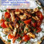 This Greek Chicken Gyros recipe features juicy, marinated grilled chicken breasts served on warm pita bread with a refreshing Greek yogurt-cucumber sauce, fresh vegetables, and crumbled feta cheese. It combines classic Mediterranean flavors like oregano, lemon, and garlic to create an authentic and flavorful dish perfect for a quick and satisfying meal.