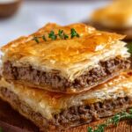Greek Phyllo Meat Pie, known as Kimadopita, is a savory, spiced pie featuring a rich ground beef filling layered inside crisp, flaky phyllo pastry. This traditional Greek dish is bursting with warm spices like allspice, nutmeg, and cinnamon, balanced by fresh herbs and a creamy egg and yogurt mixture that keeps the phyllo tender and golden. Perfect as a flavorful main course or a hearty appetizer, Kimadopita offers a delicious taste of Greece in every bite.