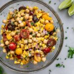 A vibrant and refreshing grilled corn and chickpea salad combining smoky grilled corn kernels with tender chickpeas, juicy tomatoes, fresh herbs, and a zesty lime dressing. Perfect as a light lunch or a flavorful side dish.