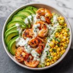 Layer your bowls starting with a bed of that fresh corn salsa, followed by the hot grilled shrimp arranged on top, and delicate slices of ripe avocado placed just so. Finish generously by drizzling that creamy garlic sauce over everything, adding a few cilantro leaves or lime wedges if you like. This step is where all the vibrant flavors come together into a stunning, irresistible meal.
