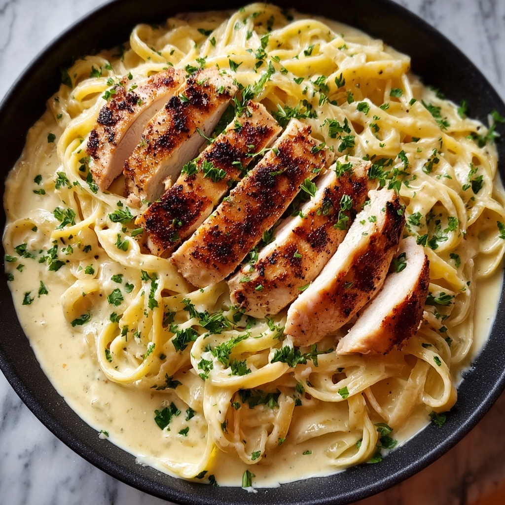 For a family-style dinner, serve the pasta in a large, shallow bowl with chicken arranged on top and parsley sprinkled generously. You can also plate individual servings, adding a lemon wedge on the side for a fresh zing that complements the creamy sauce wonderfully.