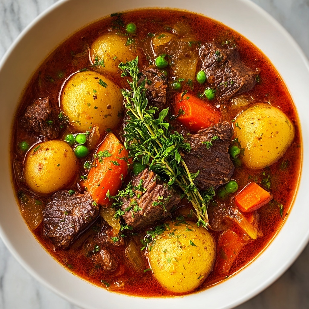 A hearty and savory slow-simmered beef stew featuring tender chunks of beef chuck, aromatic vegetables, and a rich broth enhanced with red wine and herbs. Perfect for a comforting meal during cooler months.