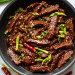 This Hot and Spicy Beef recipe features tender flank steak strips stir-fried with dried chili peppers and green onions, coated in a flavorful, slightly sweet and tangy sauce made with soy sauce, coconut sugar, hoisin, and garlic. Ready in just 20 minutes, this dish is perfect for a quick, satisfying meal with a spicy kick.
