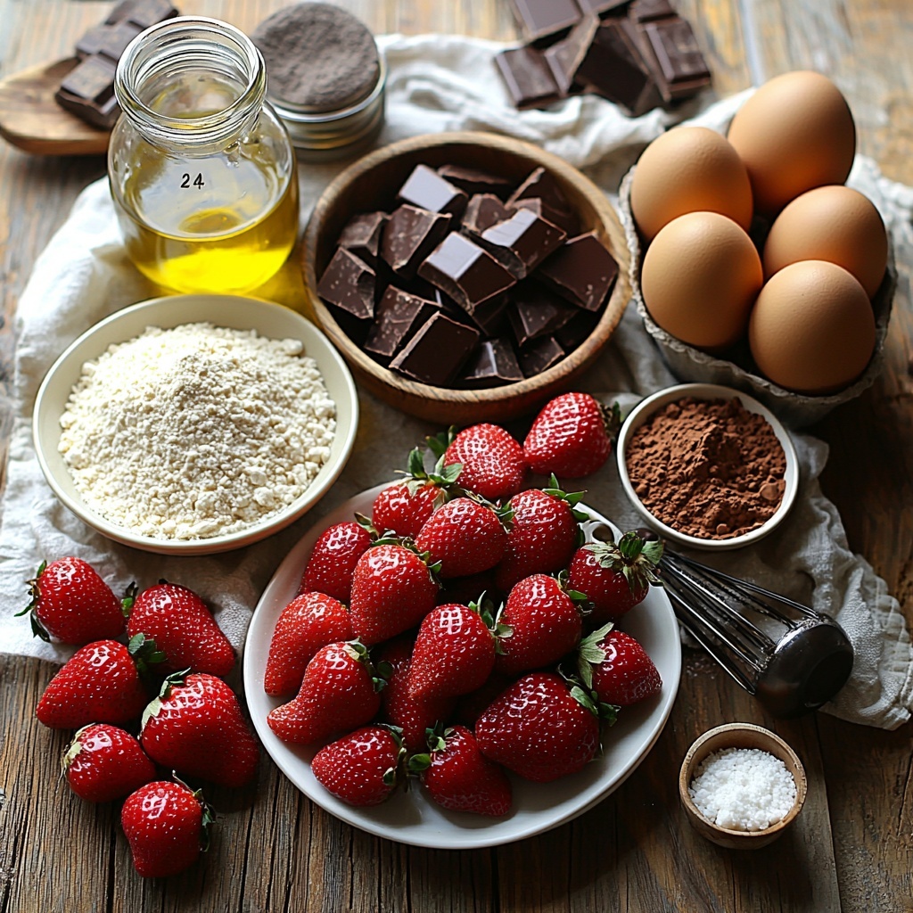 This recipe calls for straightforward, everyday ingredients, each playing a vital role in crafting the texture, flavor, and appearance of your cake. From the fluffy flour base to the luscious strawberries and rich dark chocolate, every component is essential in bringing this dessert to life.