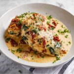 For an elegant presentation, slice the cooked chicken and fan it out over a bed of risotto or creamy polenta, then drizzle generously with the Tuscan sauce. Another fun option is serving the chicken over garlic toasted bread for a rustic, hearty meal that’s perfect for soaking up the sauce.
