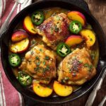 Return the seared chicken thighs to the skillet and spoon the peach glaze over them, ensuring they’re well coated. Just before serving, sprinkle the sliced fresh jalapenos on top to add that burst of heat and a pop of color that makes this dish come alive.
