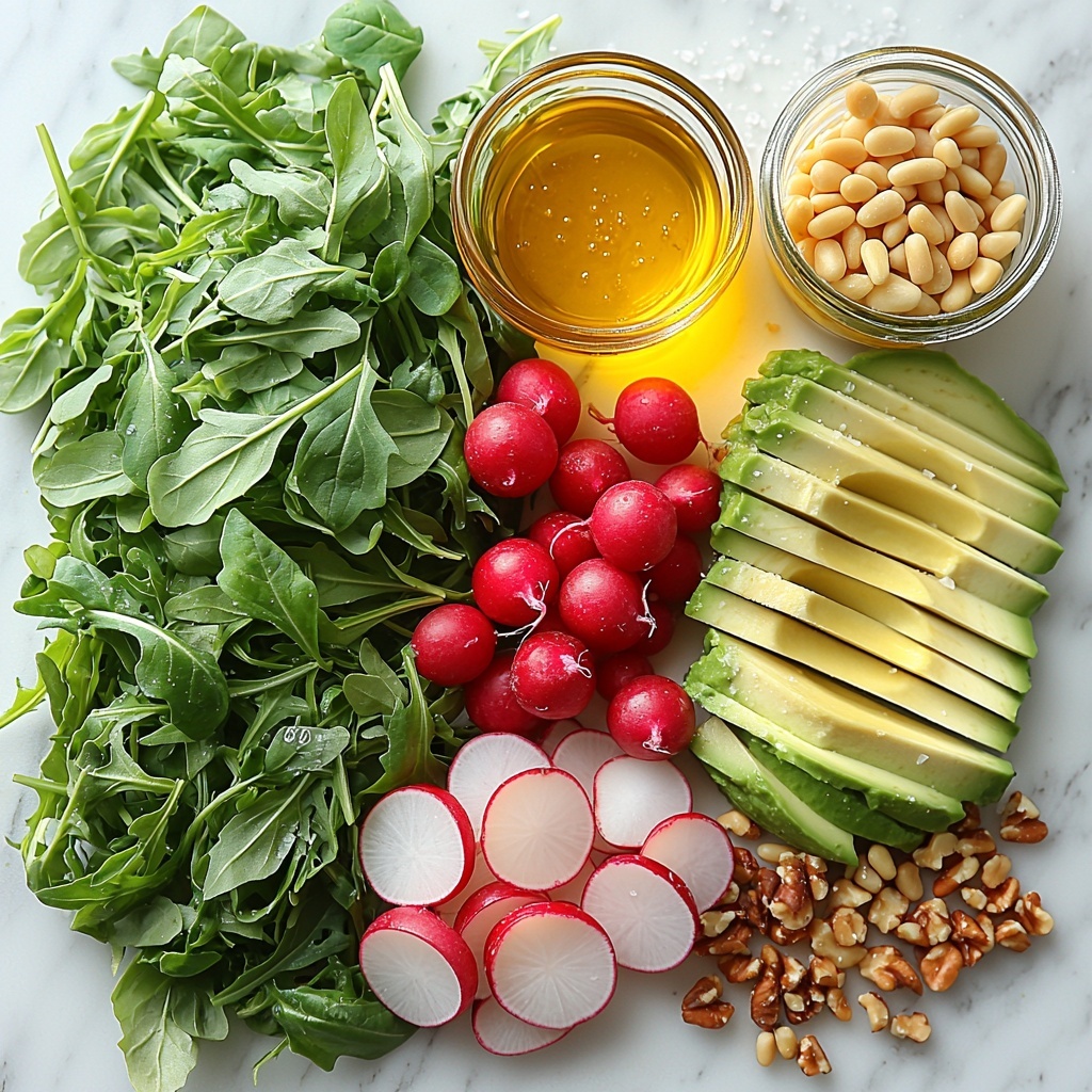 Start by adding your fresh arugula, chiffonade of basil, shaved Parmesan, thinly sliced radishes, and the toasted pine nuts into a large salad bowl. This mix sets the foundation with contrasting textures—the soft leaves against the crisp radishes and crunchy pine nuts make eating this salad an absolute joy. You can refrigerate this base for up to 24 hours if preparing in advance, which is a real time-saver.