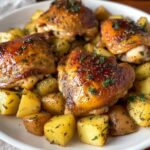 This Lemon Herb Chicken & Potatoes recipe combines juicy, tender chicken thighs marinated in a zesty lemon and aromatic herbs mixture, paired perfectly with roasted cubed potatoes. Oven-baked to golden perfection, it’s a simple yet flavorful meal ideal for a comforting dinner.