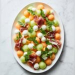 This Melon Prosciutto Salad is a refreshing and elegant appetizer combining sweet cantaloupe and honeydew melon balls with savory prosciutto and creamy Ciliegine mozzarella. Drizzled with a simple olive oil and balsamic glaze dressing and finished with fresh herbs, this salad is perfect for summer gatherings or light meals.