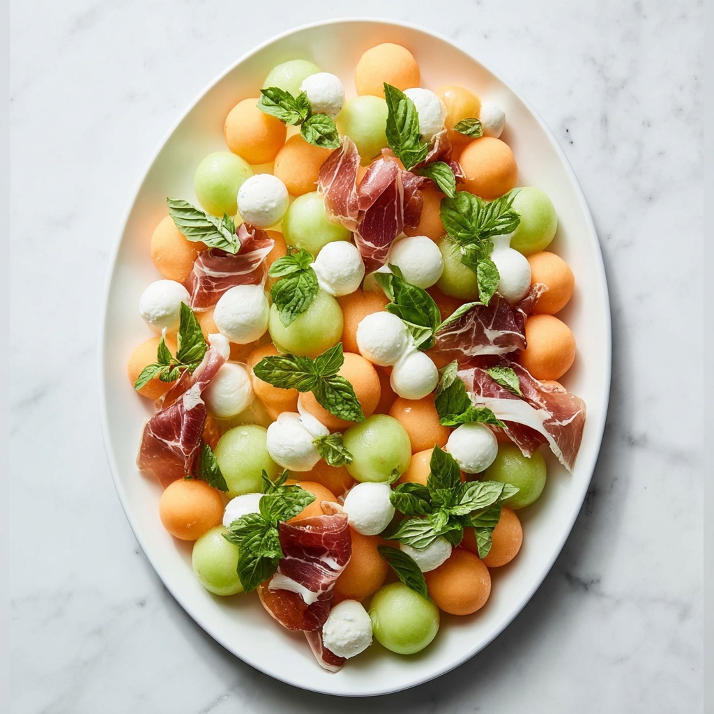 To impress your guests, try layering the melon, prosciutto, and mozzarella balls in a glass trifle dish or in clear jars for single servings. Serve on a platter lined with arugula or baby spinach to add a peppery crunch and vibrant greens. You could also skewer melon balls, mozzarella, and prosciutto on small picks, then drizzle the balsamic glaze on top for an elegant finger food twist.