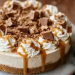This No-Bake Snickers Cheesecake is a rich and indulgent dessert combining creamy cheesecake filling with crunchy chopped Snickers bars and luscious caramel sauce, all set atop a buttery graham cracker crust. Perfect for a crowd-pleasing treat that requires no oven time, it’s a delightful blend of chocolate, caramel, and peanut flavors with a smooth texture that melts in your mouth.