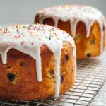 - Prepare and Apply Glaze: When the breads are at room temperature, whisk together powdered sugar and lemon juice in a medium bowl to make the glaze. Adjust thickness by adding a little water if too thick or more powdered sugar if too runny. Pour the glaze evenly over each bread. Optionally, sprinkle colorful sprinkles on top before the glaze sets to decorate.