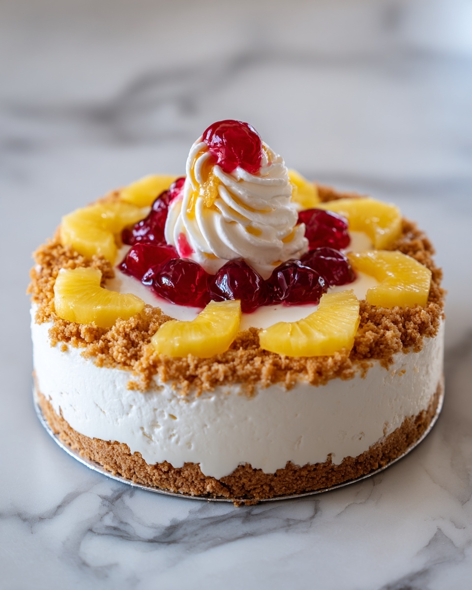 This Pineapple Right Side Up Cheesecake combines a buttery graham cracker crust with a caramelized pineapple layer topped by a creamy, smooth cheesecake filling. Baked in a water bath for perfect texture and garnished with cherries and whipped cream, it offers a tropical twist on a classic dessert that’s perfect for any occasion.