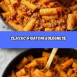 A classic Italian Rigatoni Bolognese recipe featuring a rich and hearty meat sauce made with ground beef and pork, slowly simmered with vegetables, tomato paste, crushed tomatoes, and milk. Served over perfectly cooked rigatoni pasta and garnished with Parmesan cheese and fresh herbs, this comforting dish is perfect for a satisfying family meal.