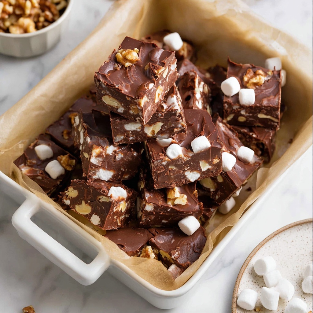 While the classic rocky road is irresistible on its own, you can dress it up with an extra sprinkle of chopped walnuts, a light dusting of cocoa powder, or even a drizzle of melted chocolate for some show-stopping flair. A sprinkle of flaky sea salt also elevates the flavor by adding a subtle savory contrast.