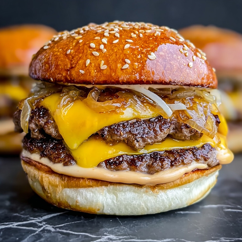 This Savory Oklahoma Onion SmashBurger recipe delivers juicy, crispy-edged burger patties layered with sweet, caramelized onions and melted American cheese, nestled in soft brioche buns. Enhanced with a tangy homemade sauce and pickles, this burger perfectly balances bold flavors and textures, making it a standout meal for any burger lover.