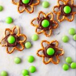 Celebrate St. Patrick’s Day with these festive Shamrock Pretzels, a quick and easy treat featuring pretzel sticks and twists topped with melted ROLO candies and green mint M&M candies to create adorable shamrock shapes. Perfect for a fun holiday snack or party favor.