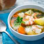 Any leftover Shrimp and Fish Soup (Ukha) Recipe should be cooled to room temperature and stored in an airtight container in the refrigerator. It will keep well for up to two days. Keep in mind that the seafood can become a bit firmer as it chills, so it’s best enjoyed fresh or within a short time after cooking.