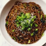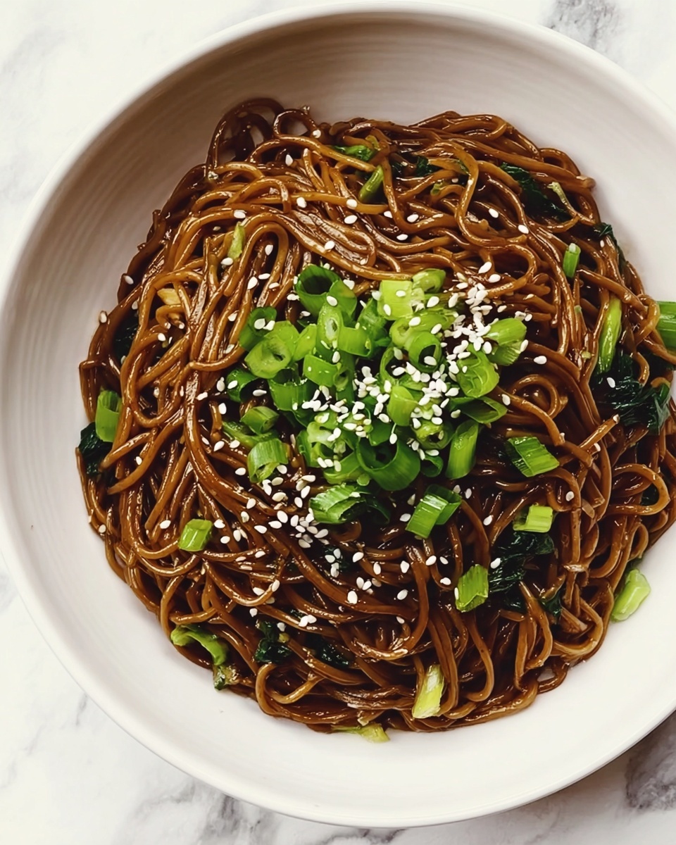Transfer the noodles to a serving dish and sprinkle generously with chopped green onions and toasted sesame seeds. These final touches not only look stunning but add fresh brightness and nutty crunch that complete the dish perfectly.