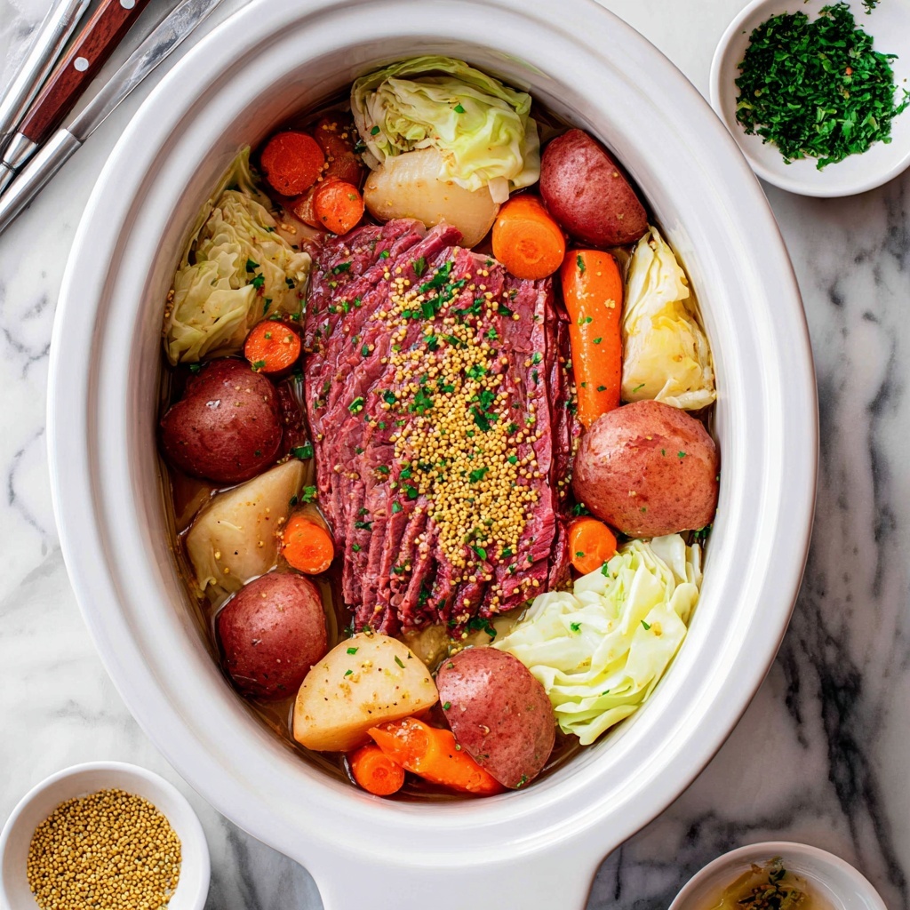 Arrange the sliced corned beef on a platter surrounded by the cooked vegetables. Drizzle some of the flavorful cooking liquid over everything, and don’t forget to spread whole-grain mustard on the meat — it adds a zingy kick that perfectly complements the richness. Garnish with fresh parsley and serve your masterpiece warm to delight family and friends.