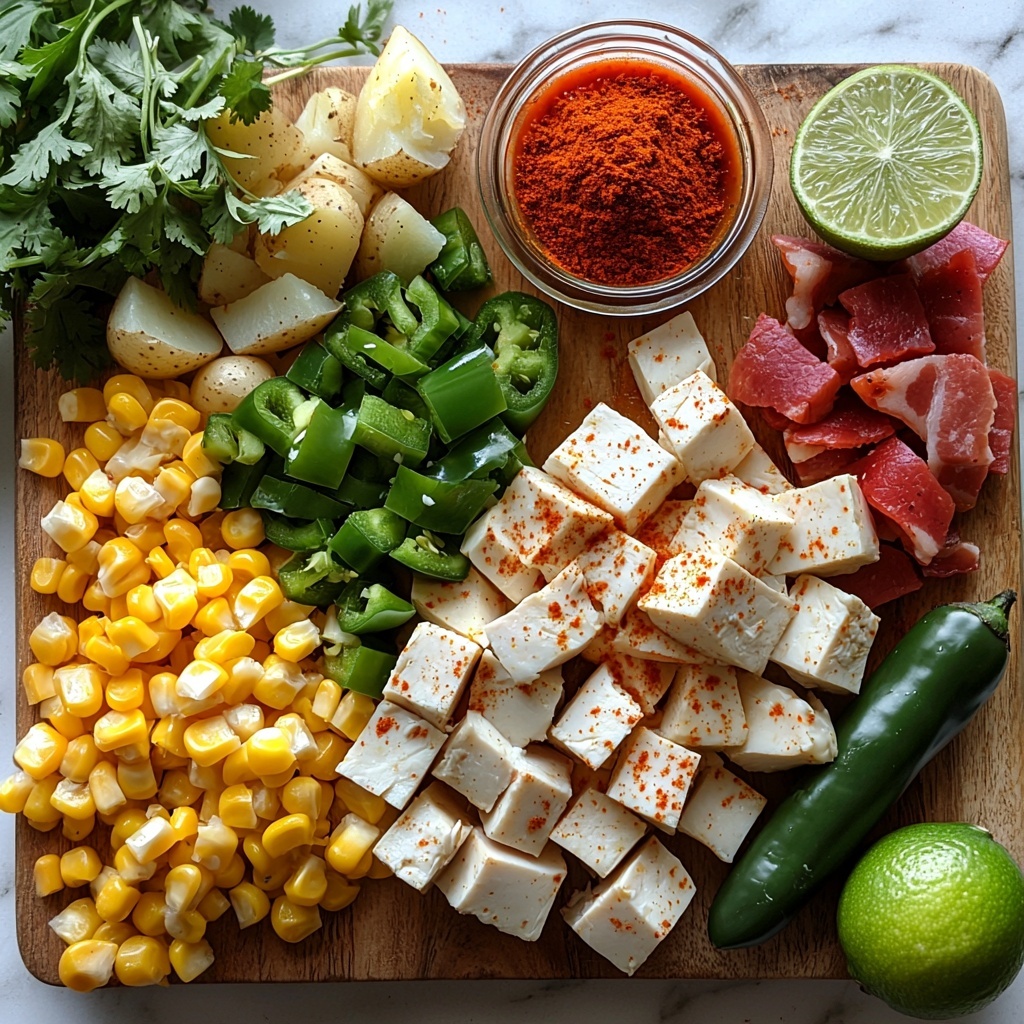 - Combine in Slow Cooker: Transfer the sautéed mixture to the slow cooker. Add frozen corn, diced russet potatoes, diced chipotle pepper, adobo sauce, whole chicken breasts, and chicken broth. Stir gently to combine all ingredients.