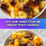 This Slow Cooker Steak and Cheddar Potato Casserole is a hearty and comforting dish featuring tender beef steak, thinly sliced russet potatoes, and sharp cheddar cheese all slow-cooked to perfection. The casserole combines savory flavors from sautéed onions, garlic, Worcestershire sauce, and a creamy beef broth mixture, making it an ideal warm meal for cozy gatherings or family dinners.