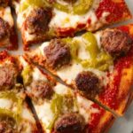 Distribute the cooked sausage evenly over the dough, ensuring each slice will have a hearty portion. Next, scatter sliced pepperoncini peppers across the pizza. Their tangy, slightly spicy flavor contrasts perfectly with the rich sausage, making this bite truly unforgettable.