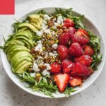 A vibrant and refreshing Strawberry Crunch Salad combining peppery arugula, sweet strawberries, creamy avocado, tangy goat cheese, and crunchy toasted almonds and pistachios, all tossed in a zesty honey-Dijon vinaigrette. Perfect for a light lunch or a delightful side dish.