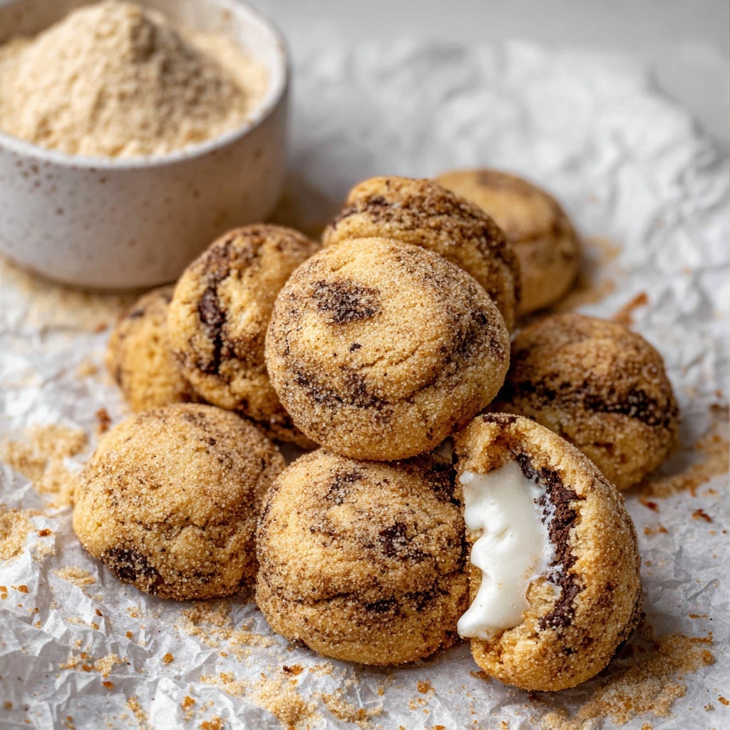 Use a tablespoon cookie scoop to portion your dough, making a deep indentation in each scoop. Place half of a large marshmallow into this hole, then encase it fully with dough, ensuring the marshmallow is completely sealed inside. Roll the ball in the cinnamon sugar mixture before placing it on your baking sheet. Leave about three inches between cookies to give them room to puff up.